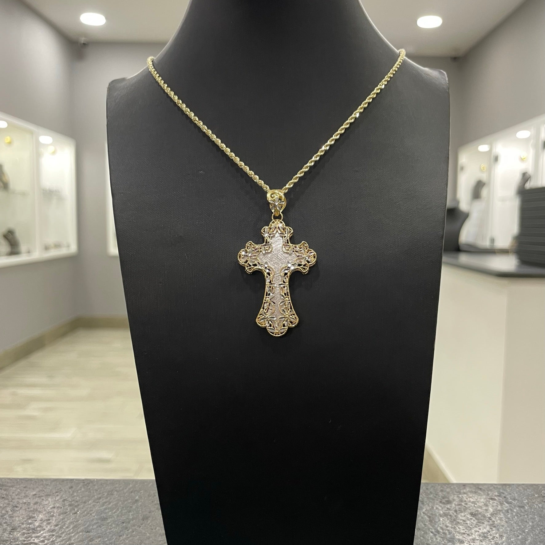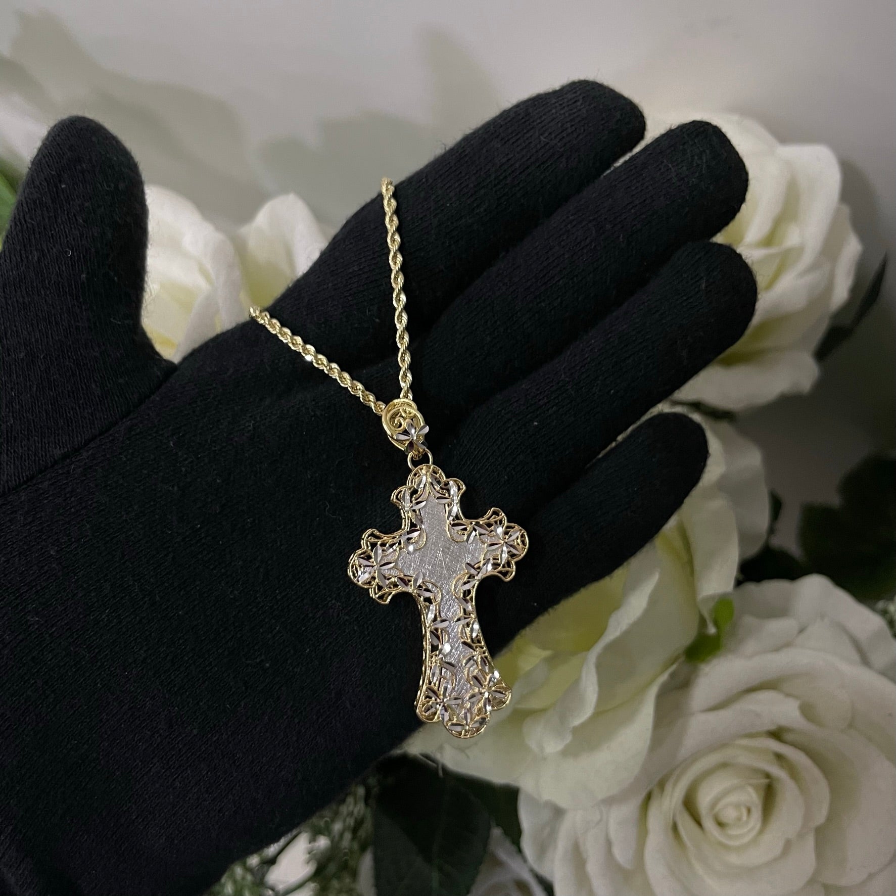Collana fune con croce traforata a fiori duo oro